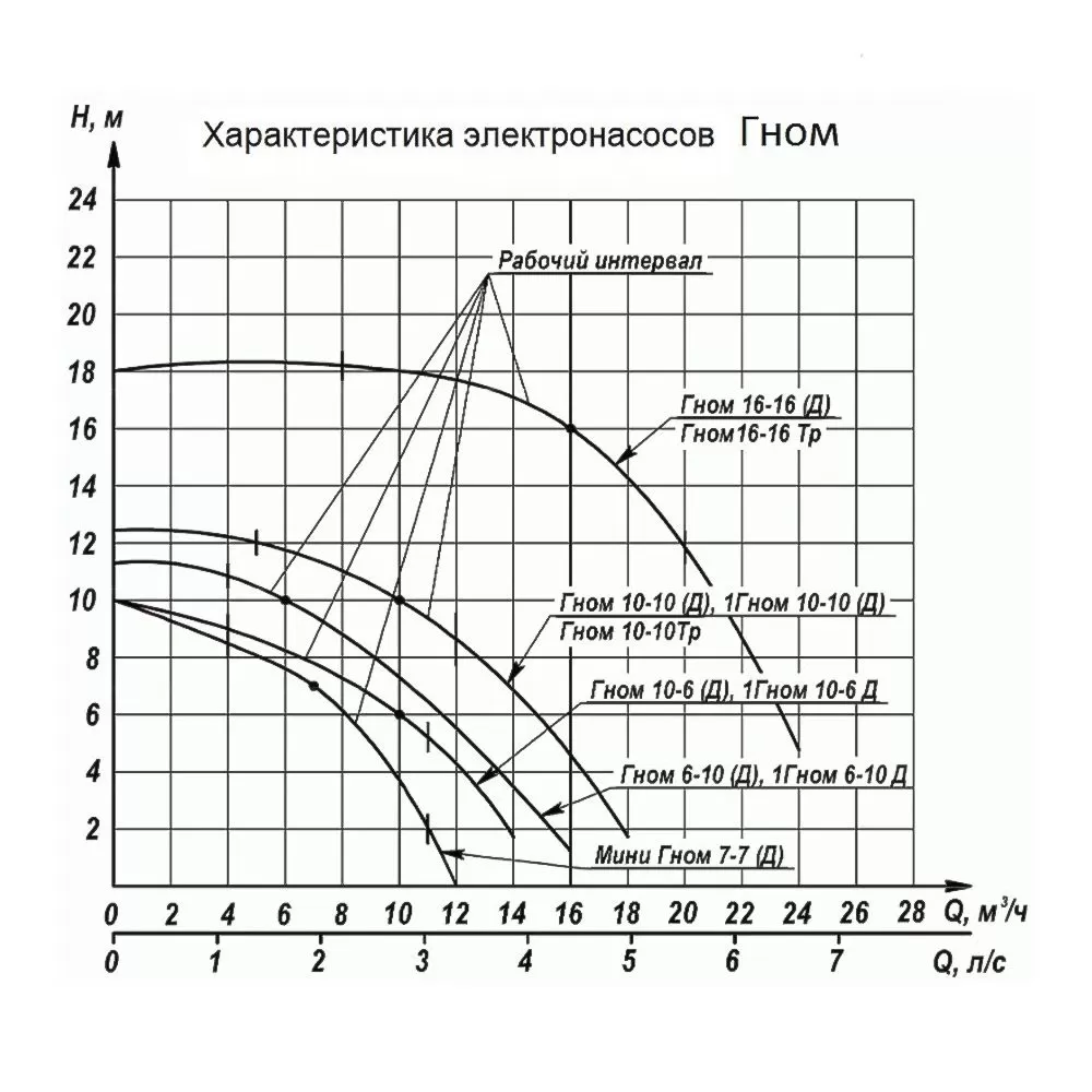 Графические характеристики дренажного насоса ГНОМ 10-10