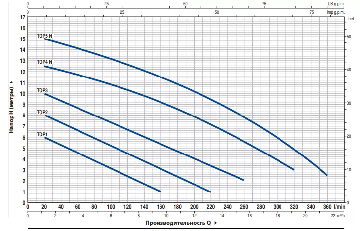Графические характеристики дренажного насоса PEDROLLO TOP 1