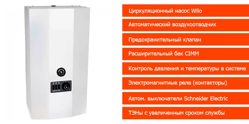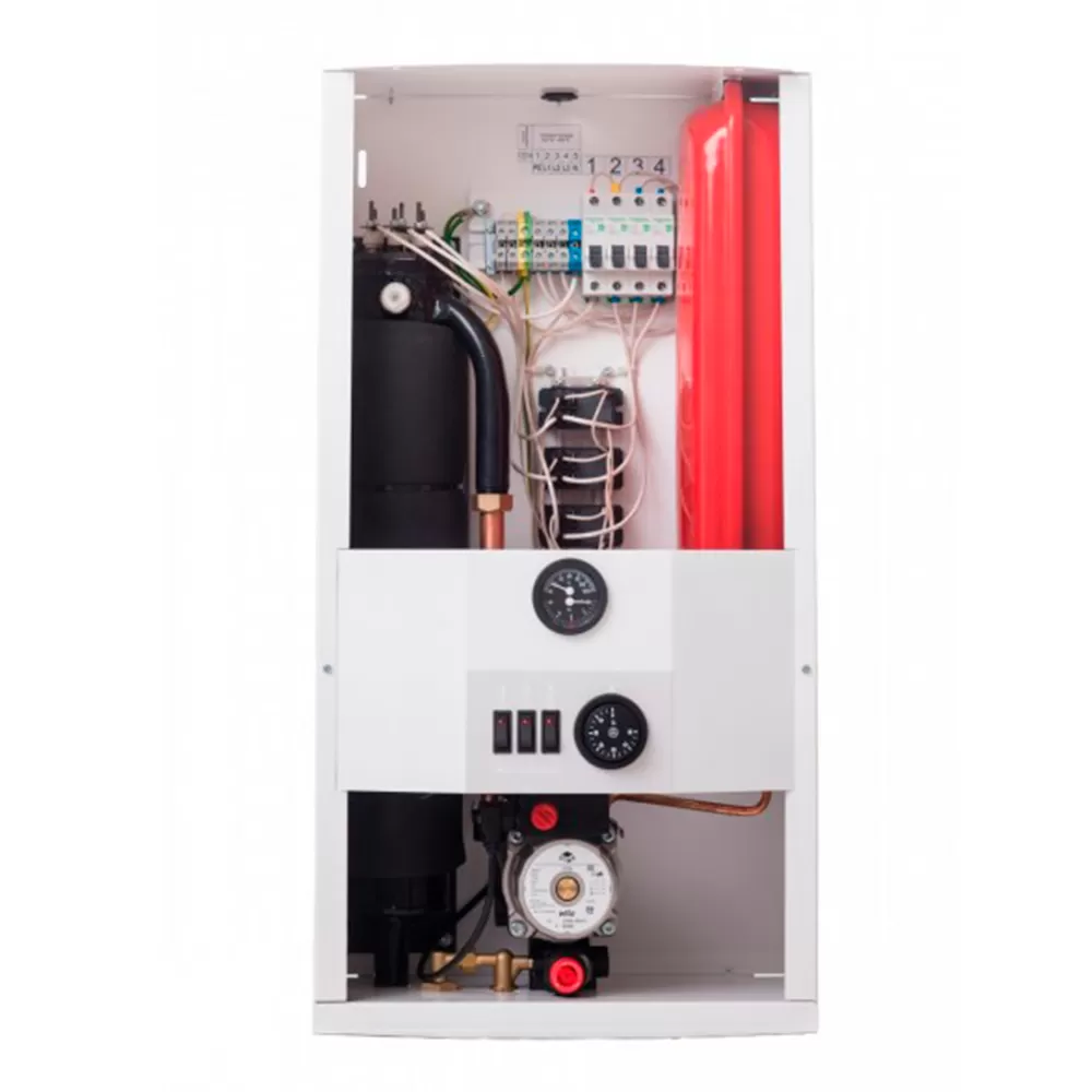 В конструкции котла предусмотрены элементы обвязки – сняв переднюю панель, мы увидим расширительный бак на 6 литров, циркуляционный насос и группу безопасности. Здесь же располагается автоматический спускник воздуха. За коммутацию нагревательных элементов отвечают электромагнитные реле. Безопасность обеспечивается автоматическими выключателями от компании Schneider Electric. Котёл предназначен для работы в отопительных системах замкнутого типа с принудительной циркуляцией теплоносителя.