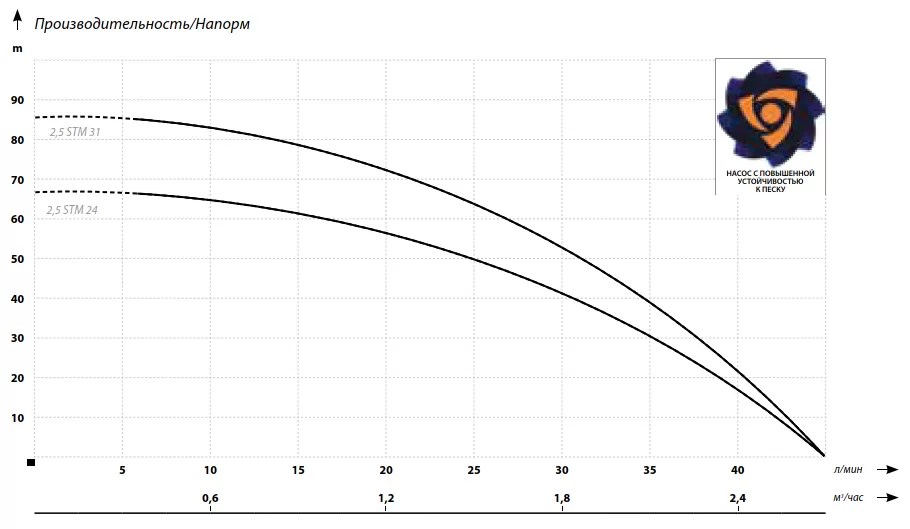 Многоступенчатые скважинный насосы диаметром 66 мм с повышенной устойчивостью к песку, рассчитанные на 3 и 4–дюймовые скважины. Насос IBO 2,5 SТM 31 кабель 20 метров обладает повышенной эффективностью к содержанию песка в перекачиваемой жидкости. Устойчивость к песку был достигнут благодаря использованию «плавающих лопастных колес» и выбору износостойких материалов. Скважинный насос IBO 2,5 SТM 31 кабель 20 метров обладает отменными характеристиками для насоса с небольшим диаметром. Максимальный напор насоса ИБО составляет 85 м, при этом максимальная производительность в пиковой точки показывает 2.7 м³/час. При таких напорно-расходных характеристиках мощность двигателя составляет всего 550 Вт. Конденсатор насоса встроен в двигатель, благодаря чему электрическая установка намного проще, чем в случае насосов со стартовой коробкой. Насос оснащен тепловой защитой, установленной в обмотке двигателя. Насос комплектуется кабелем 20 м. Основным преимуществом насоса IBO 2,5 SТM 31 кабель 20 метров является чрезвычайно высокая производительность для насоса диаметром 66 мм со скоростью до 2.7 м³/час.
