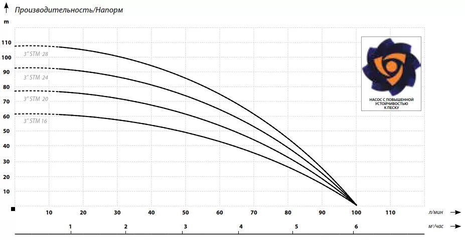 Многоступенчатые скважинный насосы диаметром 75 мм с повышенной устойчивостью к песку, рассчитанные на 3 и 4–дюймовые скважины. Насос IBO 3STM 20 кабель 20 метров обладает повышенной эффективностью к содержанию песка в перекачиваемой жидкости. Устойчивость к песку был достигнут благодаря использованию «плавающих лопастных колес» и выбору износостойких материалов. Скважинный насос IBO 3STM 20 кабель 20 метров обладает отменными характеристиками для насоса с небольшим диаметром. Максимальный напор насоса ИБО составляет 77 м, при этом максимальная производительность в пиковой точки показывает 6 м³/час. При таких напорно-расходных характеристиках мощность двигателя составляет всего 1100 Вт. Конденсатор насоса встроен в двигатель, благодаря чему электрическая установка намного проще, чем в случае насосов со стартовой коробкой. Насос оснащен тепловой защитой, установленной в обмотке двигателя. Насос комплектуется кабелем 20 м. Основным преимуществом насоса IBO 3STM 20 кабель 20 метров является чрезвычайно высокая производительность для насоса диаметром 75 мм со скоростью до 6 м³/час.