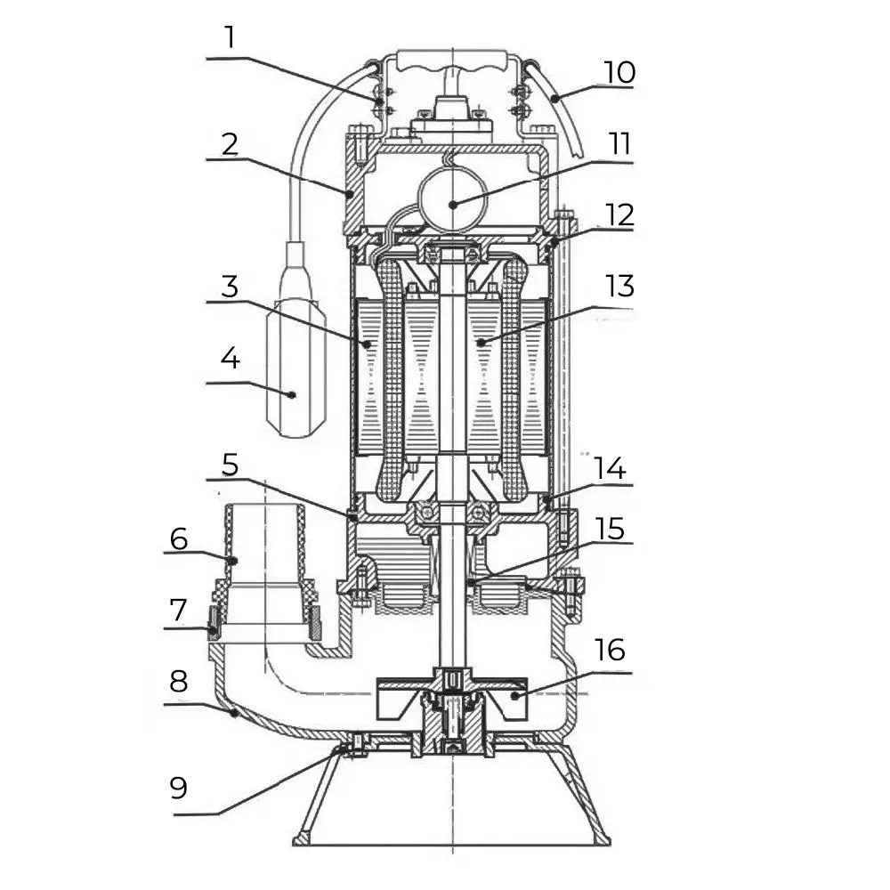 Насос также оснащен поплавковым выключателем, который автоматически включает или отключает насос при изменении уровня перекачиваемой жидкости. Это может быть полезно для поддержания необходимого уровня жидкости или предотвращения перелива. Блок аварийного отключения присутствует в разрыве силового кабеля. Это служит для обеспечения безопасности и быстрого отключения насоса в случае аварийных ситуаций или необходимости технического обслуживания.