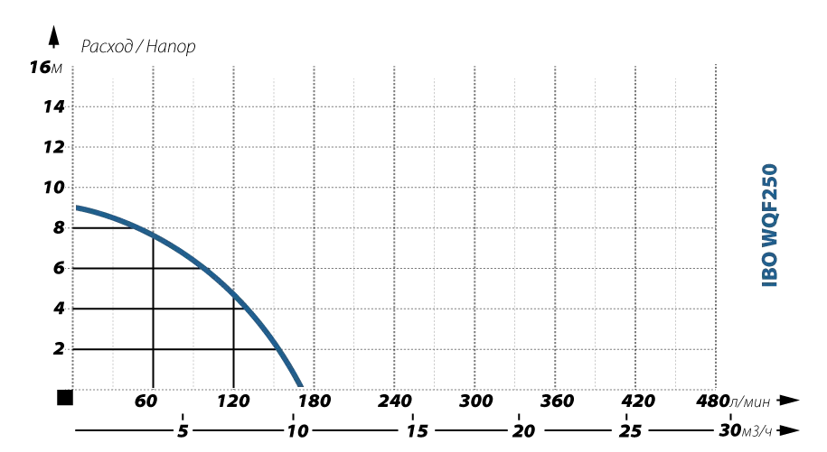 Надежность: IBO WQF 250 имеет защиту от сухого хода поплавковым выключателем, что предотвращает повреждение насоса в случае, если вода не поступает в насос.