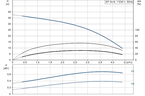 Насос Grundfos SP 3A-6 создан с применением новейших гидравлических технологий. Grundfos SP 3A-6 созданные специально для того, чтобы обеспечивать максимальную эффективность в периоды высокой нагрузки, насос имеет низкую стоимость и высокую надёжность эксплуатации вне зависимости от вида назначения. Grundfos SP 3A-6 обеспечивает высокую эффективность, высокое сопротивление абразивному износу (песку и иным абразивам), защиту от перегрева двигателя и простоту технического обслуживания. Также доступна готовая к применению система контроля и управления, предназначенная для постоянной оптимизации работы насосной системы. Максимальная производительность насоса 4.3 м3/час, максимальный напор 35 м при мощности электродвигателя 370 Вт. Насос работает от сети 220 в. Гарантийный срок на насос Grundfos SP 3A-6 составляет 2 года.