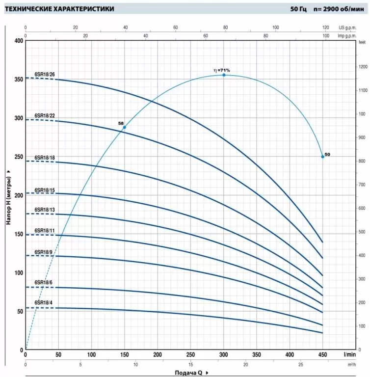 Глубинный насос Pedrollo 6SR18/6-P, отличается объективной ценой и надежной работой всех исполнительных механизмов. Насос Pedrollo 6SR18/6-P достаточно простой в эксплуатации и обслуживании, поэтому отлично подходит как для домашнего, так и промышленного применения.В основе работы Pedrollo 6SR18/6-P лежит конструктивно простой, но функционально успешный многоступенчатый центробежный принцип. Электрический двигатель подключается к агрегату через суппорт, в соответствии с нормативами международного стандарта NEMA. Мощность электродвигателя насоса составляет 5500 Вт . И при таких показателях мощности насос обладает максимальным напором в 81 метров и максимальной производительностью 27 м3/час. Функционирование Pedrollo 6SR18/6-P идентично большинству устройств, основанных на центробежных механизмах подачи воды. Жидкость втягивается в корпус устройства благодаря центробежной силе, создаваемой рабочими колесами, которые также проталкивают воду через все тело насоса "диаметр насоса 6"", а затем в нагнетающий патрубок "диаметр патрубка 3"", через который вода и попадает к конечному потребителю. Главной особенностью насоса Pedrollo 6SR18/6-P является малый диаметр корпуса агрегата, а также то, что перекачиваемая вода не касается стенок двигателя. Между жидкостью и корпусом движущей установки располагается прослойка из технологического масла, которая и предотвращает попадание мелких частиц непосредственно в исполнительный механизм. В то время как охлаждение электропривода происходит за счет верхнего способа забора воды, т.е. перекачиваемая жидкость находится всегда выше уровня расположения двигателя. Насос питается от сети в 380 в и комплектуется кабелем 4 метров.